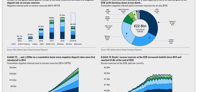 Ancora, sempre in ambito bancario, la Bce ha stabilito un sistema a due livelli per i tassi applicati ai depositi degli istituti, attraverso il quale una parte dei depositi sarà “esentata dal tasso negativo”. Il famoso tiering di stampo svizzero o giapponese di cui vi ho più volte parlato e che rappresenta un nodo fondamentale per capire la validità nel tempo del nuovo bazooka, visto quel che ci mostra questo grafico.