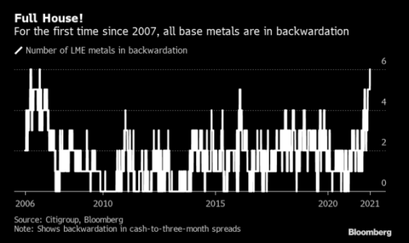 Ed è in questo quadro prospettico che si inseriscono i due grafici di oggi. Il primo è questo e ci dice un qualcosa di decisamente serio: per la prima volta dal 2007, quindi subito prima della grande crisi finanziaria, l’intera gamma dei metalli trattati alla London Metal Exchange è in modalità di cosiddetta backwardation. Ovvero, i prezzi spot sono superiori a quelli dei futures. Tradotto, l’offerta non riesce a tenere il passo della domanda.