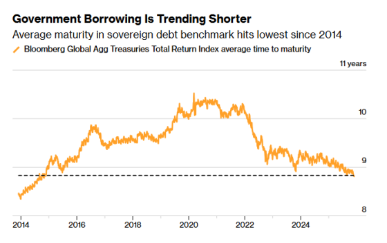 Ora partiamo da un dato che vale a livello generale: il trend è quello di una globale corsa alla riduzione delle maturities di debito pubblico negoziabile. E il benchmark sovrano già oggi è ai minimi di durata dal 2014. E nemmeno a dirlo (e nonostante l’iper-attivismo in tal senso di Scott Bessent), a guidare la pattuglia sono Giappone e proprio Regno Unito.