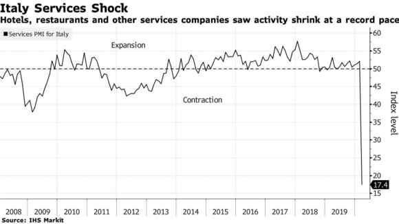 Lo stesso che ci mostra questo grafico, relativo all’andamento dell’indice dei servizi italiano. Un crollo totale, il peggiore da quando si tracciano le serie storiche. Roba da Grecia nel 2010-2011. Forse, anche peggio, visto che formalmente noi siamo ancora membri del G7, ovvero una cosiddetta potenza economica.