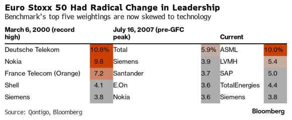 Sono i 5 titoli che, di fatto, rappresentano la versione europea del Concentration Risk statunitense. A parte il lusso di Lvmh, 3 su 5 sono tech. I chip di Asml, le soluzioni informatiche di Sap e la tecnologia per mobilità e servizi di Siemens. Oltre al coté energetico di TotalEnergies. Solo Asml e Lvmh hanno generato quasi il 27% di return sull’indice benchmark. E giova ricordare come la stella europea dei chip sia entrata a far parte dell’Euro Stoxx 50 soltanto nel 2012. E che nel 2009 vantasse un valore di mercato di 6 miliardi. Oggi di circa 320. E cosa accadde nel 2000, tanto per restare in tema di dèjà vu della bolla tech? I titoli della telefonia, Nokia in testa, pesavano per circa il 28% dell’indice. Quando saltò il tappo, bancari ed energetici corsero in sostegno. A partire da allora, diversificazione: nessun titolo eccedeva il 6% del totale. E oggi? Qual è il problema?