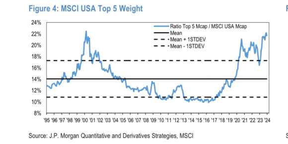 Oggi quel de-couple è ai massimi. E non è una buona notizia. Non fosse altro perché un simile spread è stato raggiunto solo in un’altra occasione: l’8 agosto 1929. In realtà, a me impressiona più quest’altro grafico, che fa riferimento al report di JP Morgan sul Concentration Risk legato ai 5 titoli leader di Wall Street. E al suo rapido approccio a livelli della prima botto tech, quello del 1999-2000.