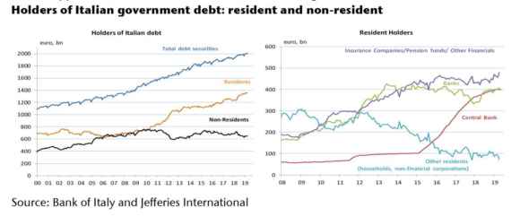 Ed ecco il secondo e ultimo punto, come mostrano questi due grafici: non solo l’Italia insieme al Portogallo e alla Spagna è leader nel doom loop a livello europeo (mettendo poi in proporzione il nostro stock di debito con quelli lusitano e iberico), ma le banche, così come le assicurazioni e i fondi cui Patuelli faceva riferimento nella sua intemerata minacciosa, ora vedono un altro soggetto operare in maniera più che attiva sul fronte della ponderazione sistemica del rischio spread sul debito pubblico. Ovvero, Bankitalia nel suo ruolo di acquirente marginale pro quota su mandato Bce in seno ai vari programmi di stimolo o Qe che dir si voglia. I quali, la cronaca recente ce lo ha dimostrato, da entrambi i lati dell’Oceano, sono destinati a restare attivi pressoché in maniera fissa e temporalmente dilatata: si danno orizzonti temporali di intervento sempre più lunghi e indeterminati, perché in cuor loro i banchieri centrali sanno che senza stimolo monetario, il sistema ormai collassa.