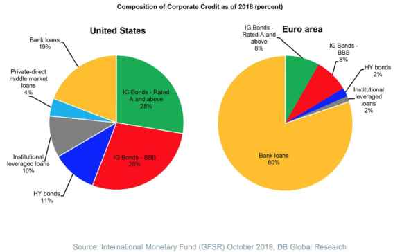 Guardate questo primo grafico, il quale ci mostra l’anomalia di base che accomuna tutta l’Europa rispetto agli Usa, nostro alleato ma anche competitor commerciale. In America la diversificazione delle fonti di finanziamento corporate è tale da vedere la dipendenza dal sistema bancario delle aziende al 19%, in Europa quella stessa voce rappresenta l’80%. Quindi, delle due, l’una. O cambiamo questa dinamica, facilitando le imprese nell’approdo verso canali alternativi come il finanziamento di mercato per via obbligazionaria (e non mi pare il caso, visto che la Bce ha cominciato il nuovo Qe proprio comprando debito corporate con il badile, nel caso di Shell e Daimler addirittura in fase di emissioni sul mercato primario) oppure si deve fare in modo che la banche dei Paesi più indebitati (Italia, Spagna, Portogallo, Grecia), evitino di acquistare strutturalmente debito pubblico per miliardi e miliardi e utilizzino invece quelle risorse come attivi verso l’economia reale. Insomma, erogare credito e gestire risparmio, non calmierare lo spread per conto del titolare del Mef di turno. Oppure sbaglio, caro Patuelli?