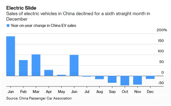 La Cina è ferma, la fabbrica mondiale di crescita si è arrestata causa pandemia: nella speranza che già da qui al secondo trimestre, lo stimolo monetario che verrà messo in pista possa ribaltare la situazione e dare vita ai proverbiali green shots, i germogli di ripresa. Speriamo, ma, torno a chiedervi, si può vivere così, di emergenza in emergenza, già nel medio termine? E se sì, per quanto? Quasi certamente, fino al 3 novembre. Ve l’ho detto da tempo, l’anno delle presidenziali negli Stati Uniti impone una campagna elettorale globale, come accade sempre agli Imperi. E la Cina è ben felice. Perché, ad esempio, questo clima di generale entropia consentirà di mettere mano al grande problema del comparto auto, visto che la China Passenger Car Association proprio in questi giorni ha reso noto i dati relativi all’intero 2019: -7,5% di vendite su base annua e 18 mesi di calo sugli ultimi 19. Di più, l’auto elettrica, quella che doveva essere l’El Dorado produttivo e di vendita, la nuova frontiere del comparto, lo scorso mese di dicembre ha visto calare gli acquisti del 42%, sesto mese di fila di contrazione, come mostra il grafico.
