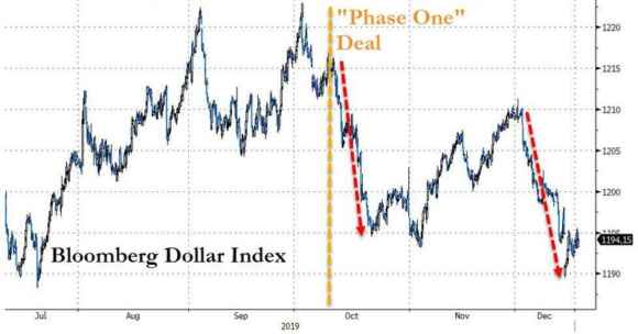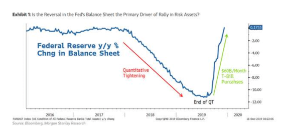 È di martedì scorso, l’altro ieri e invitava la Fed a tagliare ancora i tassi e far partire ancora il Qe, al fine di far accelerare a razzo l’export statunitense, grazie a un dollaro non più sopravvalutato sulle altre valute concorrenti. Bene, questi due grafici parlano altrettanto chiaro di quanto non faccia la profezia del 2013, ci dicono come stanno le cose. Perché non solo oggi il dollaro è ai minimi da cinque mesi sulle valute concorrenti, non ultimo grazie al tanto strombazzato accordo con la Cina, ma, soprattutto, persino Morgan Stanley ha dovuto cedere all’evidenza e ammettere, grafico alla mano, che la Fed non solo è l’unica artefice degli ultimi tre mesi di rally, ma che sta già stampando e acquistando come non faceva dai tempi della grande crisi finanziaria. Ai massimi.