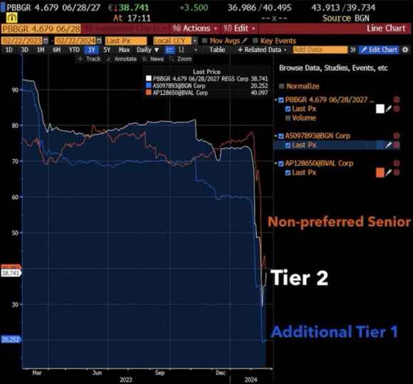 Ed ecco che il secondo grafico sposta l’attenzione in Germania. Nella fattispecie verso l’AT1 di PBB, una delle due banche come maggiore esposizione al real estate commerciale Usa.