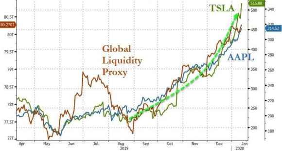 Persino la Cina, la stessa che il 1 gennaio ha liberato nel sistema 400 miliardi di liquidità attraverso l’ennesimo taglio dei requisiti bancari di riserva, per gli Usa non sarebbe più un soggetto che manipola la sua valuta: verrebbe da dire che, se lo fa al fine di unirsi al coro del Qe globale e mascherato, allora va bene manipolare ma non sottolizziamo. La tregua commerciale, poi, sarebbe alle porte con la firma della mitologica Phase One, accordo che appare chiaro e identificabile quanto il sarchiapone dell’indimenticato Walter Chiari. Wall Street, nemmeno a dirlo, veleggia trainata dai suoi cavalli di razza, Apple e Tesla, come ci mostra questo grafico alquanto eloquente: tutto meraviglioso in questo inizio di 2020 che pareva invece il prodromo della Terza guerra mondiale, unicorni a perdita d’occhio.