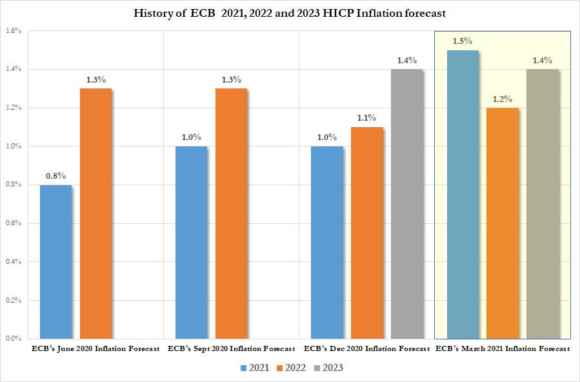 Perché non voleva o perché non poteva? Ed eccoci alla seconda dinamica emersa dal board: come mostra questo grafico, non solo rispetto alla riunione dello scorso dicembre le previsioni inflazionistiche per il 2021 sono salite dall’1% all’1,5%, ma, cosa ancora più seria, la stessa Lagarde ha dovuto ammettere che la quota obiettivo del 2% circa potrebbe essere raggiunta già entro la fine di quest’anno.