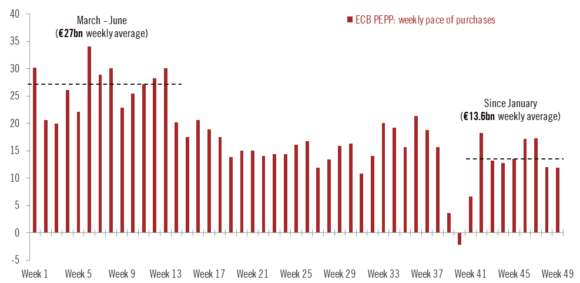 Non fatevi ingannare dai titoli: la Bce non ha affatto aumentato gli acquisti. Ha aumentato il ritmo degli acquisti. Ma la cosa più importante, Christine Lagarde non l’ha comunicata: l’utilizzo totale dell’envelop. E nemmeno l’aumento dei controvalori. Ha detto soltanto che nel secondo trimestre l’ammontare settimanale degli acquisti obbligazionari in seno al Pepp crescerà rispetto alle ultime settimane, le quali sono state caratterizzate da una crescita periodica delle redemptions. Tradotto, guardate questo grafico, il quale ci mostra appunto come da inizio anno la media a sette giorni (di fatto, quattro, quelli di trading sul secondario) sia stata attorno ai 14 miliardi. Molto meno le ultime due, rispettivamente attorno ai 12 e poco più di 11 miliardi. A causa delle redemptions, appunto.