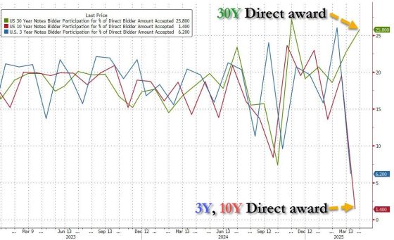 Ora date un’occhiata al grafico. Ci mostra come nell’arco di 48 ore della scorsa settimana, l’appeal interno in termini di investimento del debito Usa sia mutato. Le aste di Treasuries a 3 e 10 anni, infatti, hanno visto un netto calo della domanda interna. Mentre quella a 30 anni di venerdì l’ha vista esplodere.