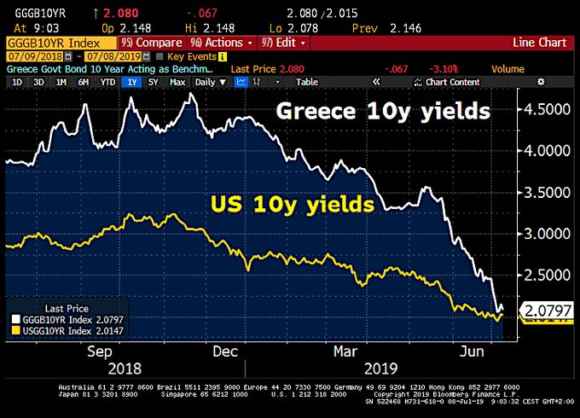 Il mondo viaggia con il pilota automatico, ormai. E, paradosso dei paradossi, i cosiddetti sovranisti – quelli che appunto sono nati formalmente per tutelare le sovranità nazionali e le volontà popolari contro le etero-direzioni di élites politiche e finanziarie – non hanno nulla da dire. Anzi, colgono – giustamente, a voler essere pragmatici – la palla al balzo. Guardate questi due grafici, poiché parlano più di mille parole: ci mostrano due reazioni pavloviane cui abbiamo assistito sui mercati negli ultimi tre giorni. Il primo è la plastica dimostrazione di come la vittoria del centrodestra in Grecia alle elezioni di domenica scorsa abbia spinto il rendimento del decennale ellenico talmente in basso da risultare meno appetibile, a livello di premio di rischio attribuito a chi lo detiene, di quello del pari durata… statunitense! Atene meglio di Washington, stando al giudizio degli investitori! Ovvero, la nazione più disastrata d’Europa, a detta di tutti, piazza debito a condizioni più favorevoli della prima potenza mondiale, oltretutto nel suo momento di massimo splendore economico! E non è un gioco della playstation, terminato il quale, si spegne la consolle e si torna alla realtà.