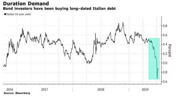 Il secondo grafico, poi, ci riguarda direttamente, perché mostra come il Governo italiano, dopo aver lanciato strali e idiozie di vario genere e grado contro Mario Draghi e la Bce per un semestre abbondante, ora abbia capito che aria tiri e si sia immediatamente adeguato: riaperta di gran carriera la stagione di caccia sull’obbligazionario sovrano dopo il proclama di Sintra ed ecco subito una bella sottoscrizione pari a 6 volte l’offerta per il Btp a 50 anni! Eh già, il Tesoro offriva 3 miliardi di carta con maturazione 2067 e ha ricevuto richieste per 17,5 miliardi di euro, manco fossimo diventati di colpo la Svizzera. E attenzione, pagando il 2,87% di rendimento sui 50 anni, praticamente 1 punto percentuale in meno rispetto soltanto alla fine del 2018. Cosa dite, in un caso e nell’altro, è tutto merito dei governi nazionali, delle loro scelte programmatiche e delle dinamiche macro dei Paesi in questione? Oppure meramente della Bce e della sua “promessa di Sintra”, ovvero tassi a zero in eterno, aste di rifinanziamento per le banche da settembre e nuovo Qe appena si sostanzierà uno scricchiolio più sinistro del dovuto? Facile governare così, cosa ne pensate? E la cosa bella è che questo Governo ha anche la faccia tosta di dire che l’Europa gli fa la guerra!