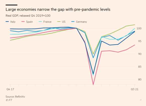 Forse no. Non subito, almeno. Questo grafico mostra infatti quale potrebbe essere il problema di divergenza dell’Ue, tanto per utilizzare la formula battezzata con garbato eufemismo dal Financial Times: la Spagna. Il cui rimbalzo del Pil dal livello di sprofondo della pandemia 2020 appare terribilmente lento, quantomeno se paragonato a quello delle altre grandi economie del Vecchio Continente. E con una dipendenza da turismo esiziale al pari della Grecia, il combinato di stagione fredda – certamente non foriera di grandi introiti nelle Isole e sulle coste – e potenziali nuove restrizioni da Covid, in caso le ondate già presenti in Gran Bretagna, Germania e Belgio (senza contare l’aumento dei contagi nel nostro Paese) potrebbe inferire il colpo mortale alla parabola discendente della crescita iberica. Più miracolosa della nostra solo a maggio e ora pesantemente rivista al ribasso dalla stessa Banca di Spagna, costretta a imbracciare il machete e dimezzare di netto l’outlook 2021.