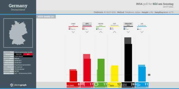 Attenzione, perché qui il rischio che si corre è quello di presumere che Mario Draghi sia già la nuova Angela Merkel e detti le regole non solo in Italia ma anche in Europa. Questa tabella è relativa al sondaggio Insa della domenica pubblicato l’11 luglio dalla Bild am Sonntag: la Cdu è avanti di 11 punti sui Verdi, i quali sono scesi ancora. E oggi sono al 17%. Come la Spd.