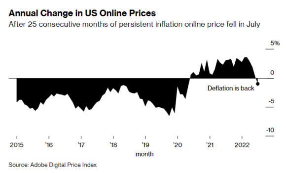 Ce lo mostra questo secondo grafico: dopo 25 mesi di aumento continuativo, ecco che in luglio per la prima volta i prezzi del commercio on-line gli Usa sono calati. Di fatto, un prodromo di deflazione. Ovvero, alta inflazione in regime di bassa crescita economica. O pre-recessione tout court.