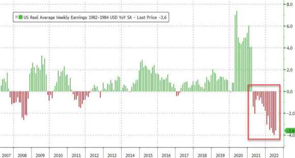 Giova ricordare che il target obiettivo è il 2%. E se invece la variazione mensile fosse del +0,2%? Sotto l’albero ci si ritroverebbe con prezzi al +7,6%. Basta andare a vedere lo studio della banca Usa, decisamente interessante. E in grado di aprire gli occhi, se lo si vuole. Perché il problema è altrove. Per l’esattezza, qui: mentre ci si arrovellava il cervello per capire se l’inflazione Usa avesse finalmente raggiunto il suo picco, ecco che le dinamiche salariali rivelate dalla media settimanale segnavano il 16° mese di fila di contrazione. Guarda caso, esattamente da quando Fed e Tesoro hanno stoppato i programmi di sostegno anti-Covid, il vero doping salariale su larga scala.