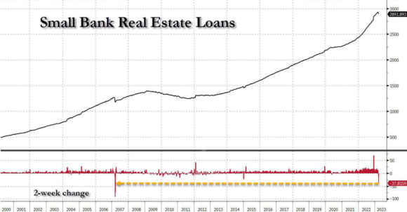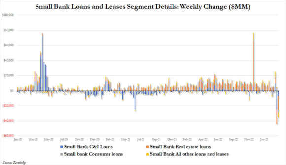 E, paradossalmente, lo conferma la stampa di casa nostra. Perché quando un quotidiano visceralmente anti-russo come La Repubblica ammette le difficoltà della contraerea ucraina, qualcosa ci dice che mesi e mesi di narrativa stanno per crollare. Ma, soprattutto, quando il medesimo giornale pubblica un articolo dal titolo Fondi immobiliari, una bolla da mille miliardi: i tassi rischiano di farla esplodere, allora tutto è chiaro. Esattamente come la dinamica rappresentata dal grafico: nel basket universitario Usa c’è la March madness, nell’immobiliare c’è la March freefall. Perché se in generale il mese scorso ha segnato un tracollo dei prestiti C&I degli istituti piccoli e medi, come mostra il grafico, è proprio l’immobiliare ad aver imboccato una scorciatoia verso la solvency phase.