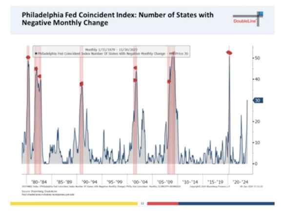 Ci mostra un indicatore pre-recessivo che, stando alle serie storiche, non ha praticamente mai fallito. Si tratta del poco conosciuto Coincident Index della Fed di Philadelphia. Ci mostra il numero di Stati degli Usa con cambiamento negativo degli indicatori economici su base mensile. In 50 anni di onorato servizio, mai un errore. Sicuramente quello di fronte a noi sarà il primo, perché stavolta è differente. Per antonomasia. Lo dice il Wall Street Journal.