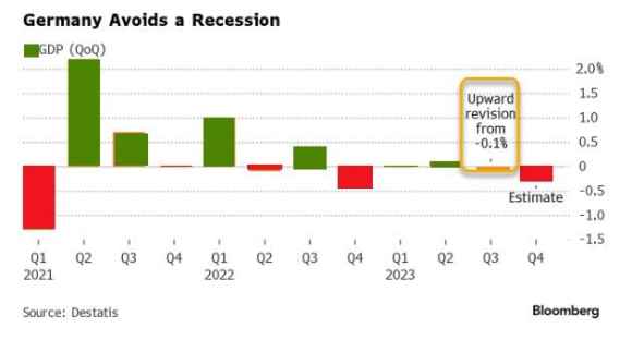 Ma veniamo all’Europa e alla sua distorsione della percezione. Ad esempio, date un’occhiata al grafico. Rendere noto urbi et orbi l’ingresso in recessione ufficiale della Germania nel giorno in cui Berlino veniva invasa e paralizzata da trattori che contestano appunto le politiche economiche del Governo, decisamente appariva poco raccomandabile. Ed ecco allora il miracolo.