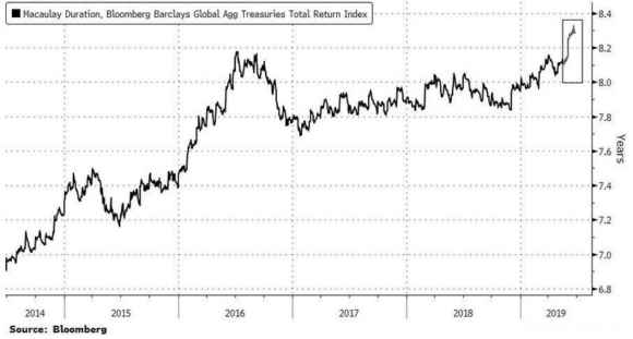 E qui non si tratta di catastrofismo, è solo matematica, semplice calcolo aritmetico. Provo a spiegarmi. L’attuale corsa ai beni rifugio sul reddito fisso, infatti, vede gli investitori acquistare qualsiasi cosa porti con sé un rendimento minimamente positivo. L’Austria è pronta a lanciare un nuovo bond a 100 anni, il secondo: sapete a quanto fisserà la forchetta di yield? Poco più dell’1%. Per carta a 100 anni! E ci sarà la fila, signori. Come c’è stata a fila alla nostra asta dell’altro giorno. L’oro è al massimo da sei anni, il Bitcoin l’altro giorno ha sfondato quota 13mila dollari, ai massimi da due anni. Insomma, un inferno di deflazione. Sapete qual è, attualmente, la duration – ovvero la misura della sensibilità ai cambiamenti sui tassi di interesse – nell’universo obbligazionario? È al record assoluto, 8,32 anni, come mostra questo grafico.