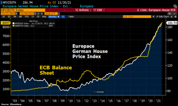 E l’immagine parla chiaro: il trend dei prezzi degli immobili si sta muovendo in perfetto tandem sincronico con l’aumento da Qe del bilancio Bce. Ma non basta. L’indice Ifo è calato a dicembre per il sesto mese di fila e questa volta in tutte le sue tre componenti (Business confidence, Expectations e Current conditions), quasi a voler offrire uno spoiler chiaro di cosa potrebbe accadere all’economia tedesca, se alla dinamica auto-alimentante dell’inflazione energetica dovesse unirsi un ulteriore e drastico rallentamento dovuto a chiusure legate alla variante Omicron.