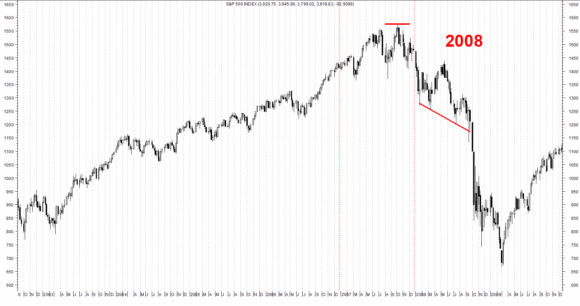 Subito il riferimento è al principale indice azionario statunitense S&P 500 che, oggetto di questa incuriosita ricerca, fa affiorare una ben nota (almeno tra i più visionari addetti ai lavori) scoperta: il parallelismo grafico tra i primi mesi del 2008 e quanto fino a oggi accaduto. L’accostamento è eloquente.