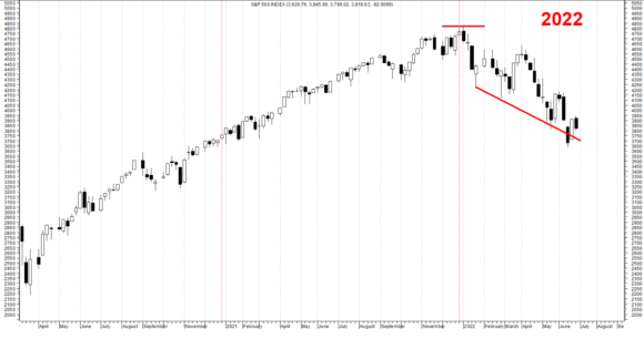 Accostando due grafici relativi all'andamento dell' indice azionario statunitense S&P 500 si nota più di una similitudine tra il 2022 e il 2008
