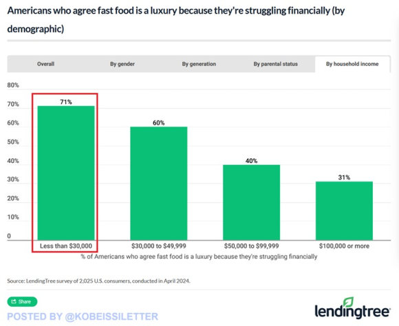 Attenzione a cosa sta accadendo sotto il pelo dell’acqua. Se persino La Repubblica nella sua edizione domenicale è stata costretta a dedicare a un articolo al sondaggio di LendingTree in base al quale per quasi l’80% degli americani andare al fast food è diventato un lusso e quindi la narrativa del soft landing appare l’ennesima panzana da stampa autorevole, forse qualcosa comincia davvero a far slittare gli equilibri.