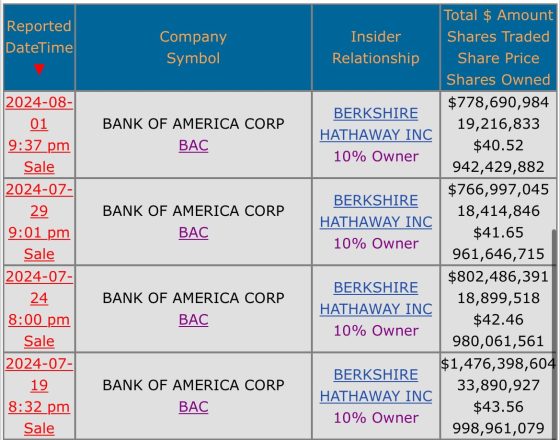 Ora date un’occhiata a questo grafico: ci mostra i controvalori di vendita di titoli azionari di Bank of America effettuati da Warren Buffet dal 19 luglio scorso all’altro giorno.