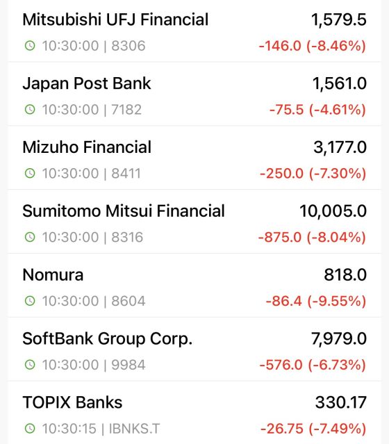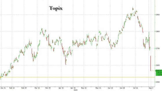 Potrei fermarmi qui e invitarvi a leggere il mio articolo di ieri, prima che il mercato nipponico crollasse letteralmente. In tre giorni sono stati bruciati tutti i guadagni di Borsa del 2024. In tre giorni. E l’esplosione dei carry trades sullo yen, dopo che la mossa della Banca centrale ha portato a un apprezzamento shock della valuta, si è immediatamente riverberata sui titoli bancari. Sprofondati letteralmente.