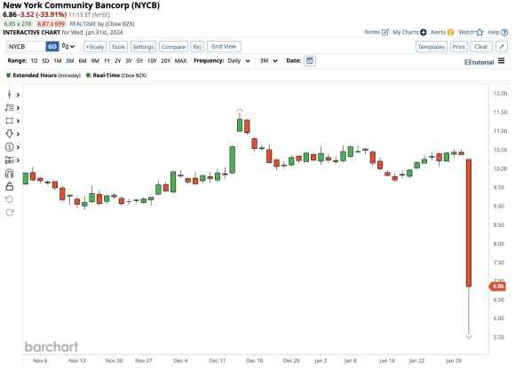 La candela della morte che vedete è riferita all’andamento del titolo della New York Community Bancorp proprio nella giornata di mercoledì. Il minimo di giornata è stato -44%. La ragione? Perdite nel quarto trimestre e taglio del dividendo di oltre due terzi.