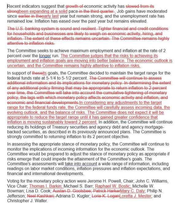 Mostra il comunicato della Fed di mercoledì sera e lo compara, tramite colorazione e cancellature, al penultimo. Un esercizio che i media Usa fanno per capire sottotraccia i cambiamenti di sentiment all’interno del Fomc. Ciò che conta è la prima frase del secondo capoverso. Cancellata. The US banking system is sound and resilient. Ma come, la stessa Fed che pochi giorni fa ha draconianamente confermato lo stop all’operatività del Btfp per l’11 marzo prossimo, nonostante 170 miliardi di utilizzo della facility ogni settimana, ora cancella la frase che conferma la solidità del sistema bancario Usa dal suo comunicato? Signori, cosa sta accadendo?