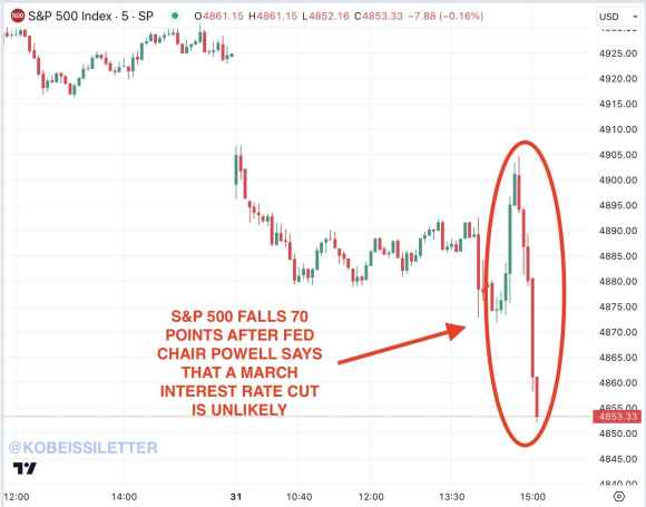 Un taglio dei tassi a marzo è altamente improbabile, ha dichiarato Jerome Powell. Questa è stata la reazione dello Standard&Poor’s 500. Qualcosa come 70 punti bruciati in 5 minuti di orologio. Ovvero, quasi 500 miliardi di market cap.