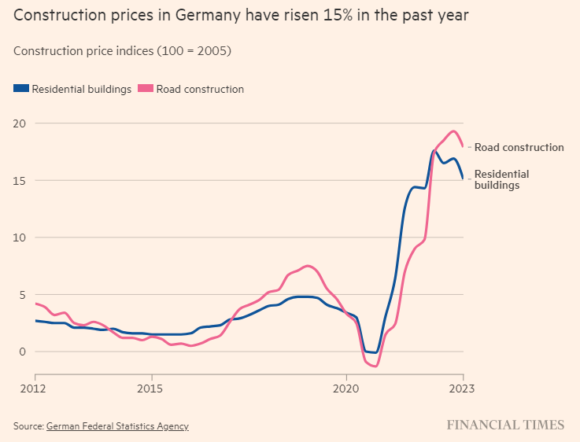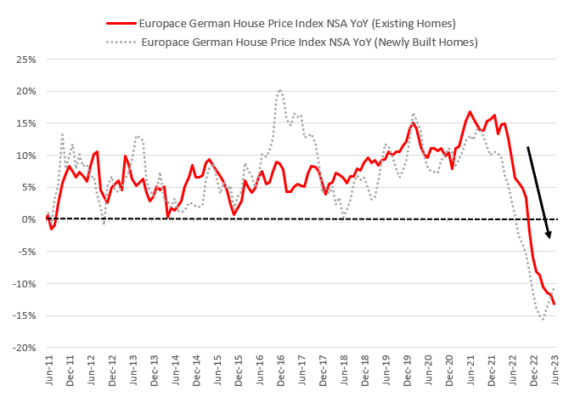 Non so se vi siete accorti, ma da qualche settimana il dibattito europeo sconta un’assente eccellente: la Germania. Ma niente analisi del Dax e dei suoi record, per carità. Sono soldi sui soldi. Legittimi. Ma se servono solo per dividendi e buybacks e non per Capex e ricerca, ormai contano zero. Anzi, avvelenano i pozzi. Forse è il caso di cominciare a dirlo. Detto questo, attenzione al primo, pesante spoiler per il nostro Paese. Perché parlando dell’outlook del comparto costruzioni tedesco, il Financial Times utilizzava l’aggettivo catastrofico. E il grafico parla chiaro: il caro-mutui determinato dall’aumento dei tassi di interesse si è sostanziato nel mese di giugno in un calo annuo dei prezzi per le case esistenti in Germania del 13,1%, peggior contrazione dall’ottobre 2004 e in ulteriore aumento dal -11,7% di maggio.