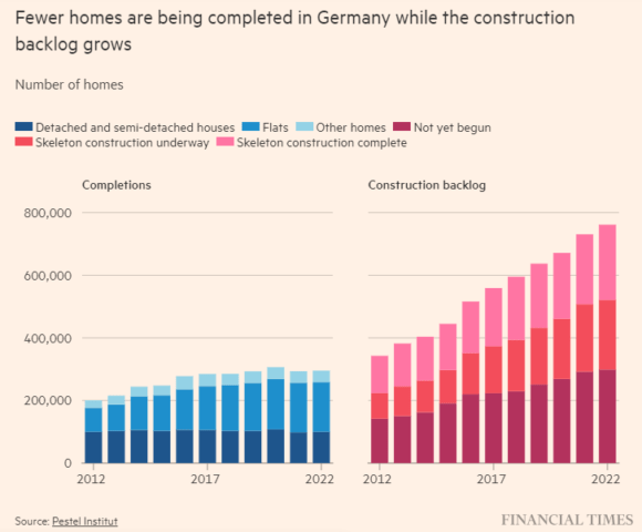 Ora guardate, invece, questi due altri grafici, soprattutto quello relativo al numero di unità completate e quelle in palese status di arretrato. Un rallentamento che fa il paio con una dinamica precedente e inversa, il preventivo aumento esponenziale dei prezzi dovuto ai tassi a zero della Bce per un periodo troppo prolungato di tempo: +15% nell’ultimo anno.