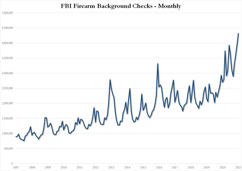 Allora, mi chiedo, se tutto è rientrato – quantomeno a livello mediatico, visto che tg e quotidiani non paiono più allarmati – come mai gli americani stanno armandosi come mai prima, come mostra questo grafico? Tutti collezionisti, di colpo? Sicuramente sarà così. Resta il fatto che i dati del National Instant Criminal Background Check (NCIS) dell’FBI dicono che dall’inizio di gennaio le armi regolarmente registrate negli Usa sono state 4,3 milioni. Il massimo record e 300.000 unità in più di quelle tracciate a dicembre, quando sembrava che il golpe sovranista dei nazisti dell’Illinois fosse dietro l’angolo.