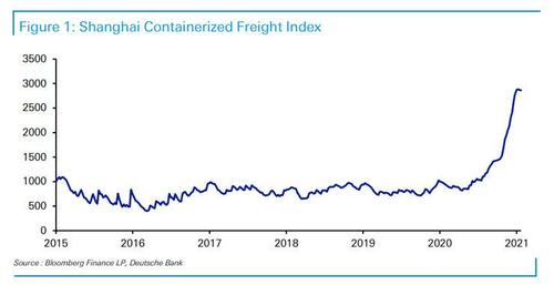 Se la bolla si sgonfia o trova un’altra camera d’aria per travasare l’eccesso o esplode: quindi, un bel rischio di reflazione. Cui se ne unisce un altro, già montante, come mostra il secondo grafico: ci mostra il trend dello Shanghai Containerized Freight Index, il quale opera da proxy delle tariffe settimanali per il trasporto merci dal porto di Shanghai (export cinese). Già oggi, più che triplicate dal maggio scorso, quando la pandemia in Cina era sparita e l’Europa cominciava a intravedere la fine dei lockdown in vista dell’estate. Quanto ci vorrà prima che il costo-extra di quelle merci trasportate venga scaricato sui consumatori? E parliamo di generi di prima necessità e di larghissimo consumo, quindi destinati in gran parte alla grande distribuzione. Alimentare e non. Forse è per timore di un picco inflazionistico in arrivo che gli americani stanno comprando armi con il badile, più del solito? O, forse, è per nascondere questo rischio incombente che si opera il gioco delle tre carte sulle letture ufficiali degli indici come il PMI e CPI?