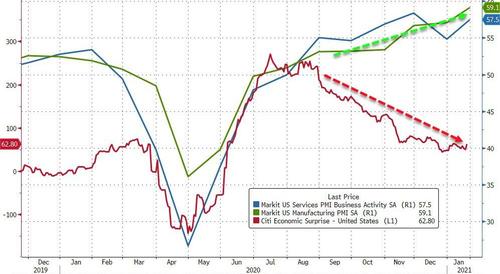 Di più, tre delle cinque settimane con il più alto numero di armi vendute e denunciate alle autorità oggi fanno riferimento al mese di gennaio 2021. Solitamente, una persona perbene (un criminale non denuncia la pistola, la compra al mercato nero) si arma perché ha paura, perché ritiene insufficiente il grado di sicurezza garantitogli dalle autorità. O andranno tutti a caccia di cervi con una Glock 19? Mistero. Un po’ come quello racchiuso in questo secondo grafico, il quale ci mostra un’altra incredibile esplosione occorsa lo scorso mese di gennaio negli Usa, quella dell’indice PMI sia manifatturiero che dei servizi. Il primo, addirittura al suo massimo storico con il 59.1 contro attese di 56.5 e una lettura su base mensile precedente del 57.1.