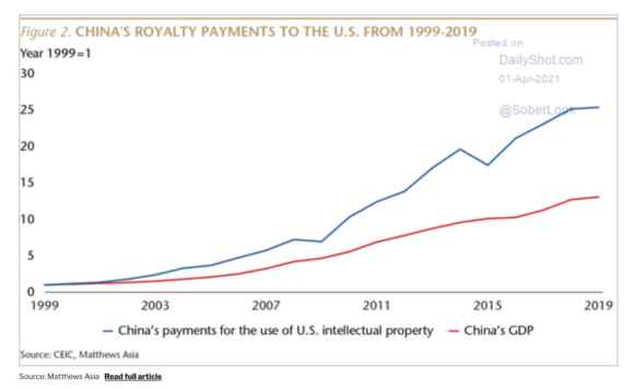 Certo, le pratiche non ortodosse, sia di dumping valutario e fiscale che salariale che sui dazi non sono mancate negli anni del boom della globalizzazione, negarlo sarebbe ipocrita. Ma il fatto è che la Cina, piaccia o meno, oggi viaggia su livelli di investimento in ricerca e sviluppo che hanno superato per la prima volta quelli statunitensi. E avanti di questo passo, solo nel 2025 il gap sarà diventato di 304 miliardi a favore di Pechino. Dagli 8 attuali. Ma ecco che la seconda immagine sembra ridimensionare pesantemente gli argomenti di chi vede nella Cina unicamente il regno del sotterfugio, della concorrenza sleale e della contraffazione: l’America a partire dal 2000 è stata ben contenta di incassare miliardi in royalties dalla Cina. Tradotto, ha svenduto per denaro la sua proprietà intellettuale. Subito dopo il boom, in entrambe i sensi, del comparto tech a cavallo del cambio di millennio. All’epoca la Cina non era forse comunista, autoritaria e poco incline al rispetto pedissequo dei diritti umani? Repressione in Tibet e fatti di piazza Tienanmen erano già avvenuti e anche Hong Kong era già tornata sotto controllo di Pechino da tre anni. Gli yuan, però, facevano più gola. Tanta.