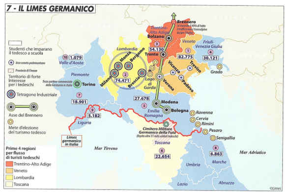 E visto che uno dei mantra assoluti di questo Paese, quando ciclicamente si dà vita a dibattiti sul rilancio dell’economia, è quello che fa riferimento al petrolio italiano, ovvero il turismo, ecco che questa altra cartina mostra plasticamente quali siano le mete del turismo tedesco. Ovvio, è molto più romantico e politicamente corretto parlare di inglesi innamorati del Chiantishire o americani stregati dalla grande bellezza di Roma, peccato che tedeschi e austriaci, orrendi nella loro abbinata sandalo-calzino bianco, abbiano le tasche piene. Molto piene. E spendano. E siano tanti, percentualmente. Molto più degli americani o degli inglesi. E che, a differenza di questi ultimi, in un futuro che vedrà il turismo per via aerea probabilmente ancora penalizzato e rallentato dal fall-out del Covid (vedi solo il dibattito sul passaporto vaccinale), possano raggiungere il Garda o la Riviera adriatica o il Sudtirolo in auto o pullman o treno.