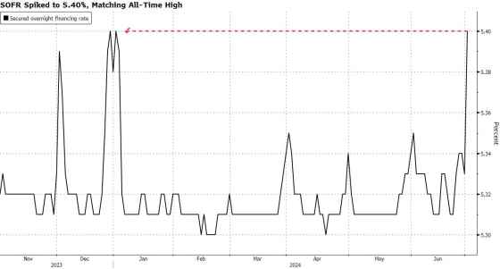 Il Sofr è il tasso di rifinanziamento overnight. Ovvero, il tasso a cui le banche si prestano soldi a brevissimo termine per le operazioni di routine. Come ricorderete nei momenti di crisi sistemica, quel valore rappresenta il vero termometro del timore di controparte. Bene, fra lunedì e martedì, quel tasso è passato da 5,33% a 5,40%. Il massimo storico. Questo mentre sui giornali e in televisioni, le uniche notizie che paiono giungere dal mercato sono i continui rialzi. E, a loro volta, i continui massimi storici infranti.