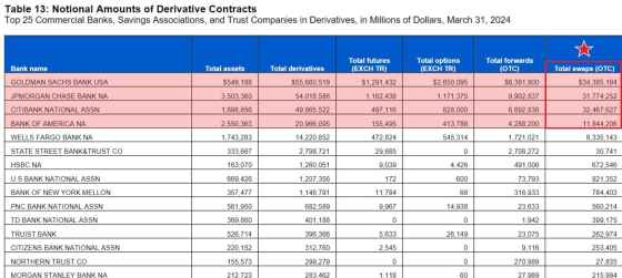 Date un’occhiata a questo. Ci mostra, debitamente evidenziato grazie a uno sfondo rosso, il valore nozionale degli swaps delle principali quattro banche messe sotto osservazione dalla Occ (Options Clearing Corporation). Ovvero, la madre di tutte le camere di compensazione.