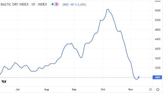 E questo perverso meccanismo non riguarda solo qualche settore, ma tutta l’economia. E l’economia globalizzata si sta bloccando. L’indice che misura il traffico delle merci internazionali è il Baltic Dry Index e il seguente grafico mostra con chiarezza cosa sta accadendo.