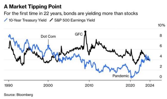 Per la prima volta da 22 anni a questa parte, i rendimenti obbligazionari spodestano le equities. Pagano un rendimento maggiore della Borsa. Big rotation or what? Forse, semplicemente, un gioco da Banche centrali decisamente pericoloso, ancorché obbligato da un mondo completamente manipolato? Perché questo secondo grafico mostra altro.