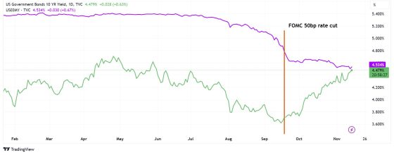 I rendimenti obbligazionari non scendono e rischiano di creare l’incidente appena descritto, purtroppo con margine di epilogo fuori controllo non eliminabile ed escludibile a tavolino? Nessun problema, ricomincia il flip flop. Dove prima era tutto inflazione, ora torna la retorica del soft landing. L’economia sta bene, quindi perché avere fretta nel tagliare i tassi? Inquietante, se queste parole sono pronunciate dal numero uno della medesima istituzione che li ha tagliati addirittura di 50 punti base non più tardi di metà settembre, poi di altri 25 punti base e fino al giorno prima era battezzata come pronta a un terzo intervento a dicembre.