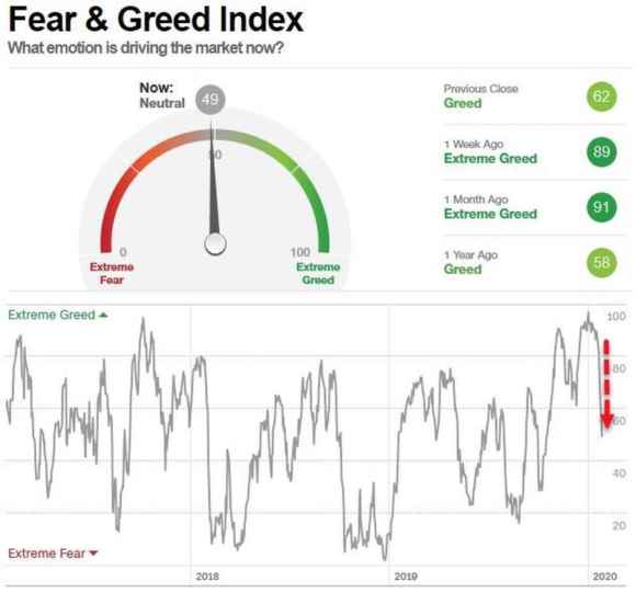 Volete capire quanto la Borsa sia manipolata, falsa, incapace ontologicamente di rappresentare la realtà economica di un Paese o del mondo intero? Non ci vuole molto, bastano due elementi. Uno grafico e l’altro, per così dire, “politico”. Quello grafico è bello e servito nel grafico che ci mostra il crollo del sentiment di mercato tracciato dell’indicatore Fear&greed della CNN. Chi mi segue, si ricorderà che non più tardi di dieci giorni fa avevo già pubblicato quel tracciatore ed era al massimo storico, roba da bolla precedente al botto nel 1999 e nel 2007. Direte voi, il coronavirus ha cambiato tutto. Mica tanto: il problema reale è sorto soltanto con il tonfo delle Borse asiatiche di ieri, perché anche la giornata di lunedì aveva visto Wall Street tamponare le perdite, non fosse altro per le barzellette assortite che la stagione delle trimestrali garantisce (leggete i numeri offerti da Tesla, a fronte della crisi cinese dell’auto elettrica e fatevi due risate).