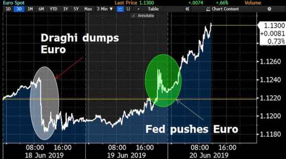 Tanto rumore per nulla o tanto tuonò che piovve? La Fed non si aspettava una mossa così spiazzante da parte di Mario Draghi. Non ora, quanto meno. E qualcosa è andato fuori giri. Non sto parlando della facciata di ufficialità, quella ha retto. Con il passare dei giorni, il mercato aveva infatti visto calare dal 30% al 21% le possibilità di un taglio dei tassi alla riunione del Fomc conclusasi mercoledì. Per tre motivi. Primo, il combinato congiunto con il G20 che si terrà il 28 e 29 giugno prossimi a Osaka, ritenuto uno spartiacque nella disputa commerciale fra Usa e Cina. Quindi, meglio rimandare azzardi prima di un appuntamento simile e andare con i piedi di piombo, soprattutto in tempi di svalutazione valutaria latente, ma già in atto, come mostra il grafico qui sotto. Secondo, evitare di apparire troppo proni alle richieste del mercato e, sopratutto, ai diktat politici della Casa Bianca e dei suoi tweets ormai seriali, quasi rasenti allo stalking. Terzo, non consentire una lettura eccessivamente critica dell’aumento dei tassi compiuto non più tardi dello scorso dicembre, di fatto facilmente bollabile come “errore politico” dai detrattori più o meno interessati. Donald Trump in testa. La sindrome Greenspan. O Trichet, scegliete voi il fallace che preferite.