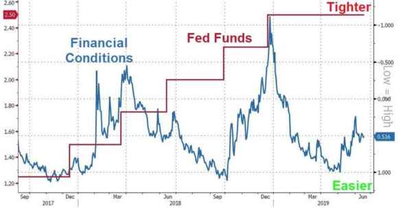 Una boutade, ovviamente. Ma nulla accade per caso, tantomeno attorno alla Fed. La quale, state certi, a luglio interverrà. E non perché lo dico io o per le pressioni della Casa Bianca, ma per quanto ci mostra questo grafico, il quale esemplifica il livello attuale delle condizioni finanziarie già prezzate dal mercato. Insomma, siamo al minimo storico, ovvero a un grado di aspettativa molto alto rispetto a mosse di carattere espansivo. Quel livello, state certi, incorpora più di un taglio da qui a fine anno. Come minimo due, ma – più facilmente e credibilmente – già tre.