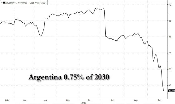 Secondo, come mostra questo secondo grafico, una situazione come quella appena descritta ha conseguenze immediate e dirette per i detentori di bond argentini, storicamente e proverbialmente l’archetipo della vittima di haircut e write-off. Quasi per antonomasia. E 43,3 centesimi sul dollaro per il bond 2030 già rappresenta un valore di negoziazione da fire sale. Da svendita.